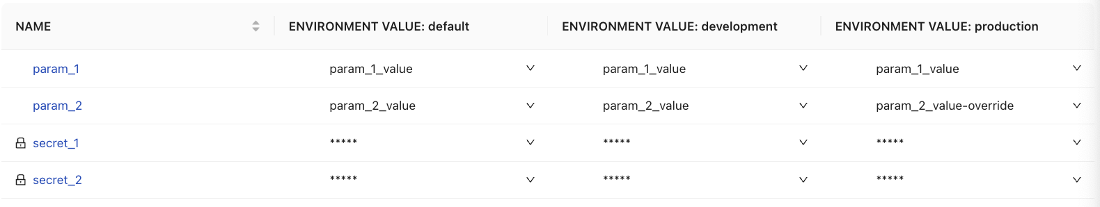 This page, while mainly used to compare values between environments, is also similar to the Parameter List table where values can be edited, secrets revealed, and overrides removed.